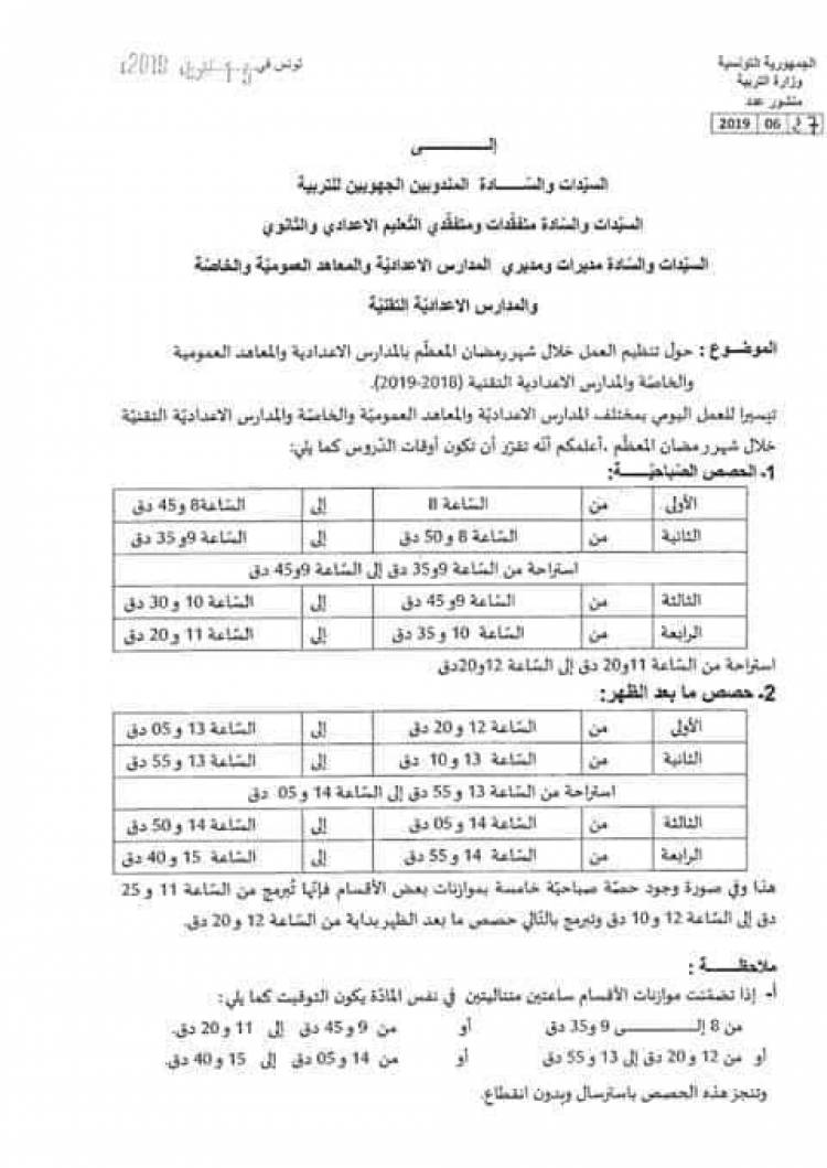 أعلنت وزارة التربية في بلاغ لها عن التوقيت المدرسي الذي سيقع اعتماده خلال شهر رمضان بالنسبة للمدارس الإبتدائية و المعاهد الثانوية و ظروف اجراء الفروض التأليفية.