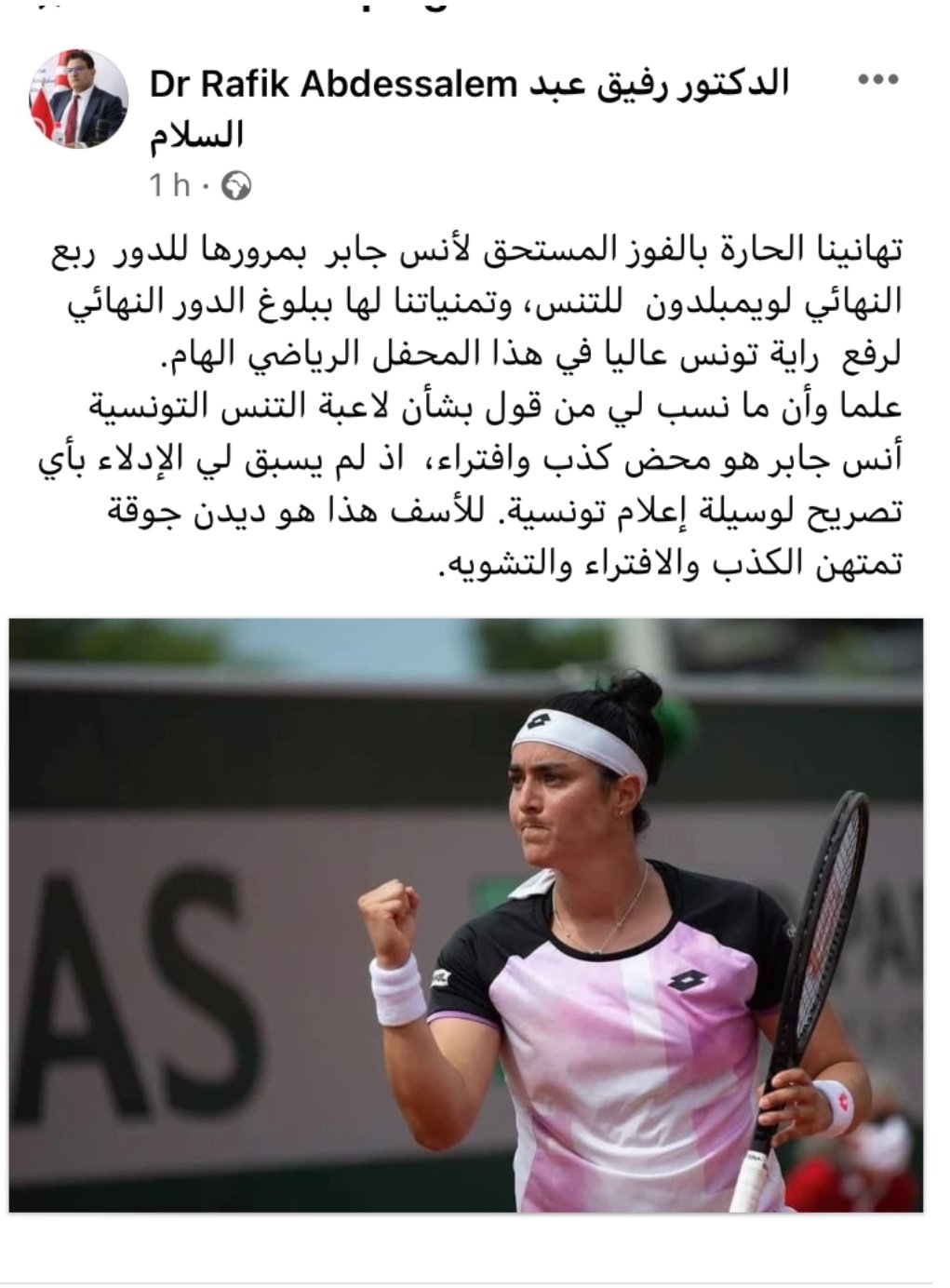 علما وأن ما نسب لي من قول بشأن لاعبة التنس التونسية أنس جابر هو محض كذب وافتراء، اذ لم يسبق لي الإدلاء بأي تصريح لوسيلة إعلام تونسية.