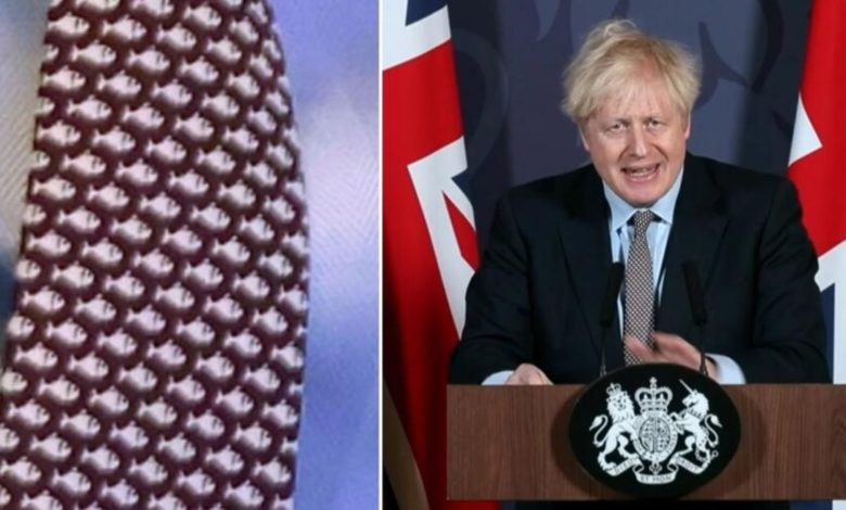 وخلال إعلانه حدوث انفراجة في مفاوضات بلاده مع الاتحاد الأوروبي التي استغرقت شهوراً، كان جونسون يرتدي ربطة عنق ذات لون داكن عليها كثير من الأسماك الصغيرة.