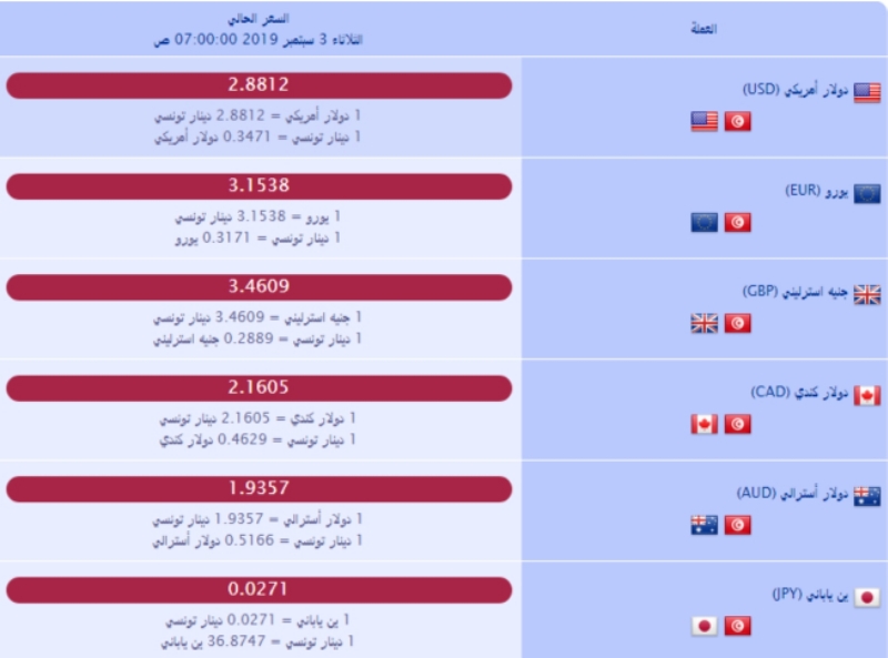 بلغ سعر صرف الاورو الاوروبي، 3.1538 دينار تونسي، في حين بلغ سعر صرف الدولار الامريكي 2.8812 دينار تونسي، وذلك وفق مؤشر أسعار العملات في تونس لهذا اليوم الثلاثاء 3 سبتمبر 2019.