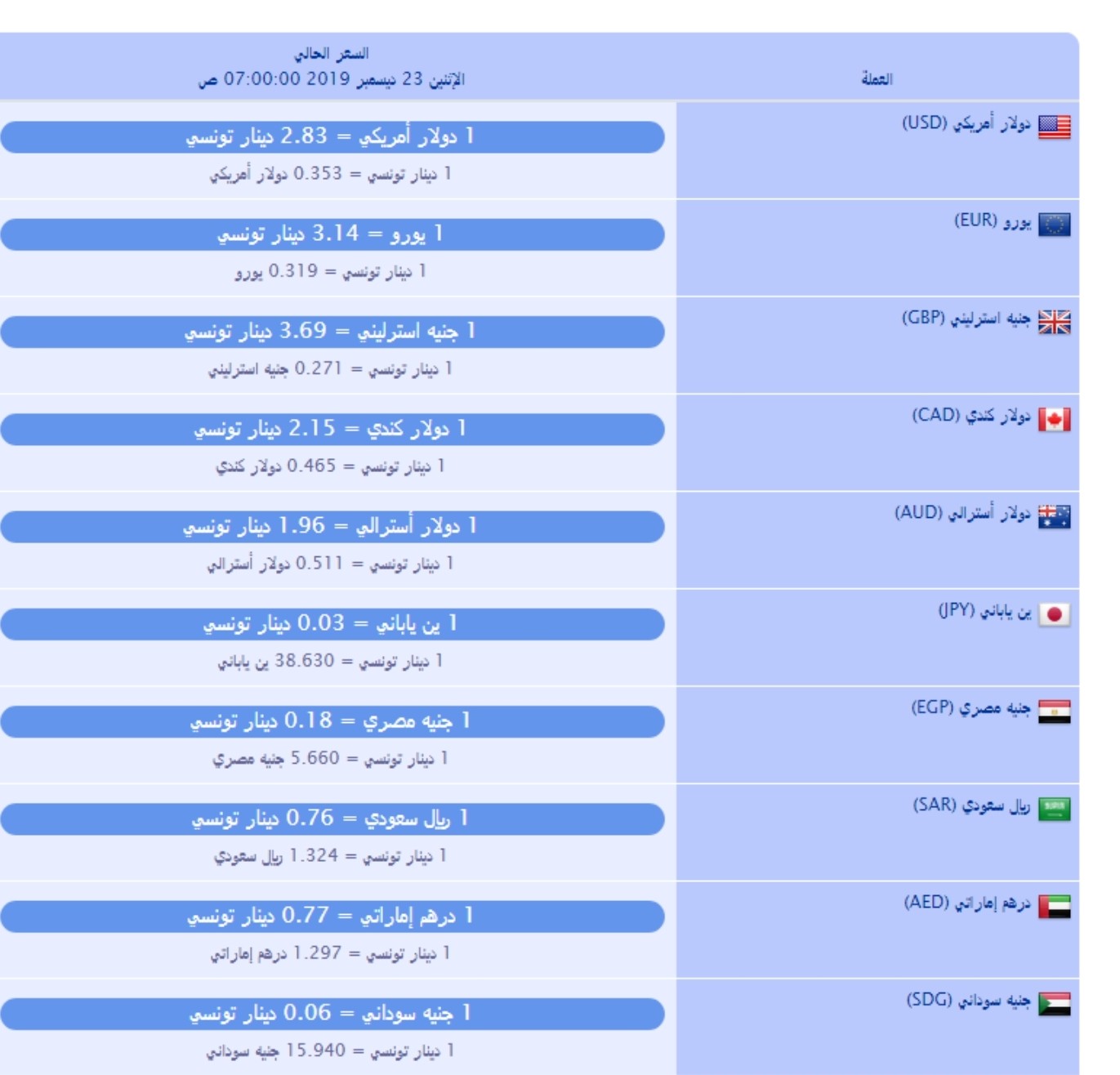 تشير أسعار صرف العملات في تونس لهذا اليوم الاثنين 23 ديسمبر 2019، إلى أن سعر صرف الاورو الاوروبي بلغ 3.14 دينار تونسي، فيما بلغ سعر صرف الدولار الأمريكي 2.83 دينار تونسي.