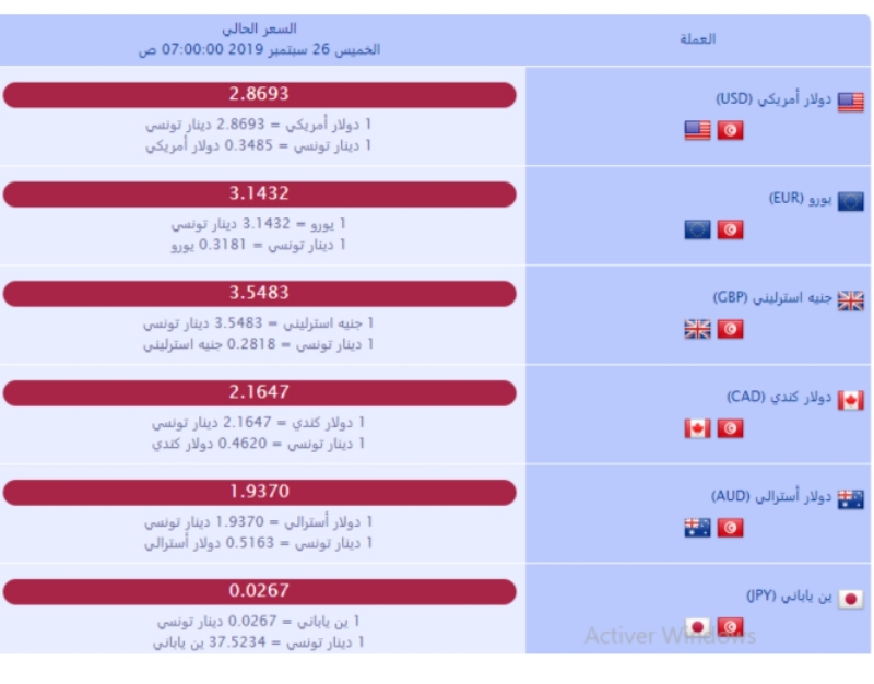 سعر صرف العملات الأجنبية بالدينار التونسي لهذا اليوم
