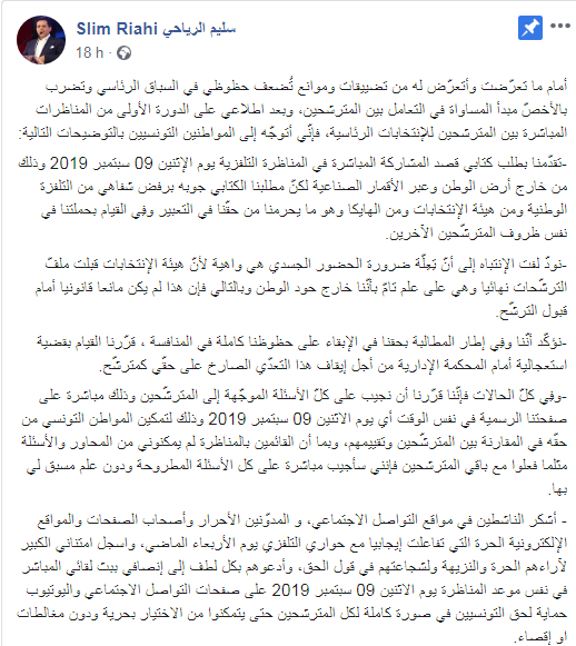 وقال سليم الريايح في تدوينة على صفحته على الفايسبوك: “تقدّمنا بطلب كتابي قصد المشاركة المباشرة في المناظرة التلفزية يوم الإثنين 09 سبتمبر 2019 وذلك من خارج أرض الوطن وعبر الأقمار الصناعية، لكنّ مطلبنا الكتابي جوبه برفض شفاهي من التلفزة الوطنية ومن هيئة الإنتخابات ومن الهايكا، وهو ما يحرمنا من حقّنا في التعبير وفِي القيام بحملتنا في نفس ظروف المترشّحين الآخرين”.