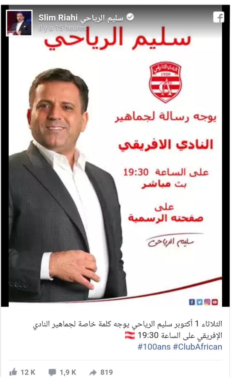 من المنتظر أن يتوجه الرئيس السابق للنادي الافريقي سليم الرياحي مساء اليوم الثلاثاء 1 أكتوبر 2019، وتحديدا على الساعة السابعة والنصف، بكلمة خاصة لجماهير النادي في بث مباشر عبر صفحته الرسمية على الفايسبوك.