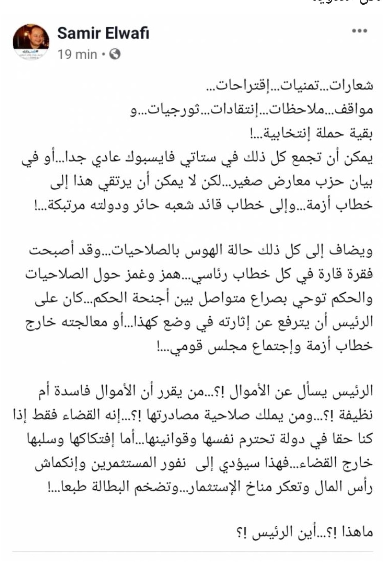 سمير الوافي في تعليقه على خطاب رئيس الجمهورية : ماهذا الهوس ،أين الرئيس !