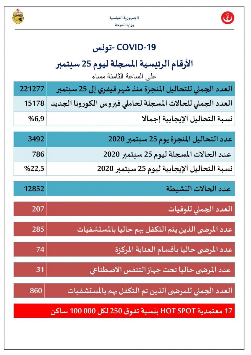 وأوضحت وزارة الصحة أنّ عدد المرضى الذين يتمّ التكفّل بهم حاليا بالمستشفيات بلغ 285 مريضا، 74 منهم يقيمون بأقسام العناية المركزة فيما يبلغ عدد الموضوعين تحت أجهزة التنفس الصناعي 31 مريضا.