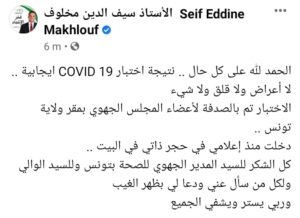 وقال مخلوف، في تدوينة على صفحته الرسمية بـ”الفايسبوك”، أنّ الاختبار تمّ بالصدفة لأعضاء المجلس الجهوي بمقرّ ولاية تونس وأنّ لا أعراض لديه، مُؤكّدا دخلوه في حجر صحّي ذاتي.