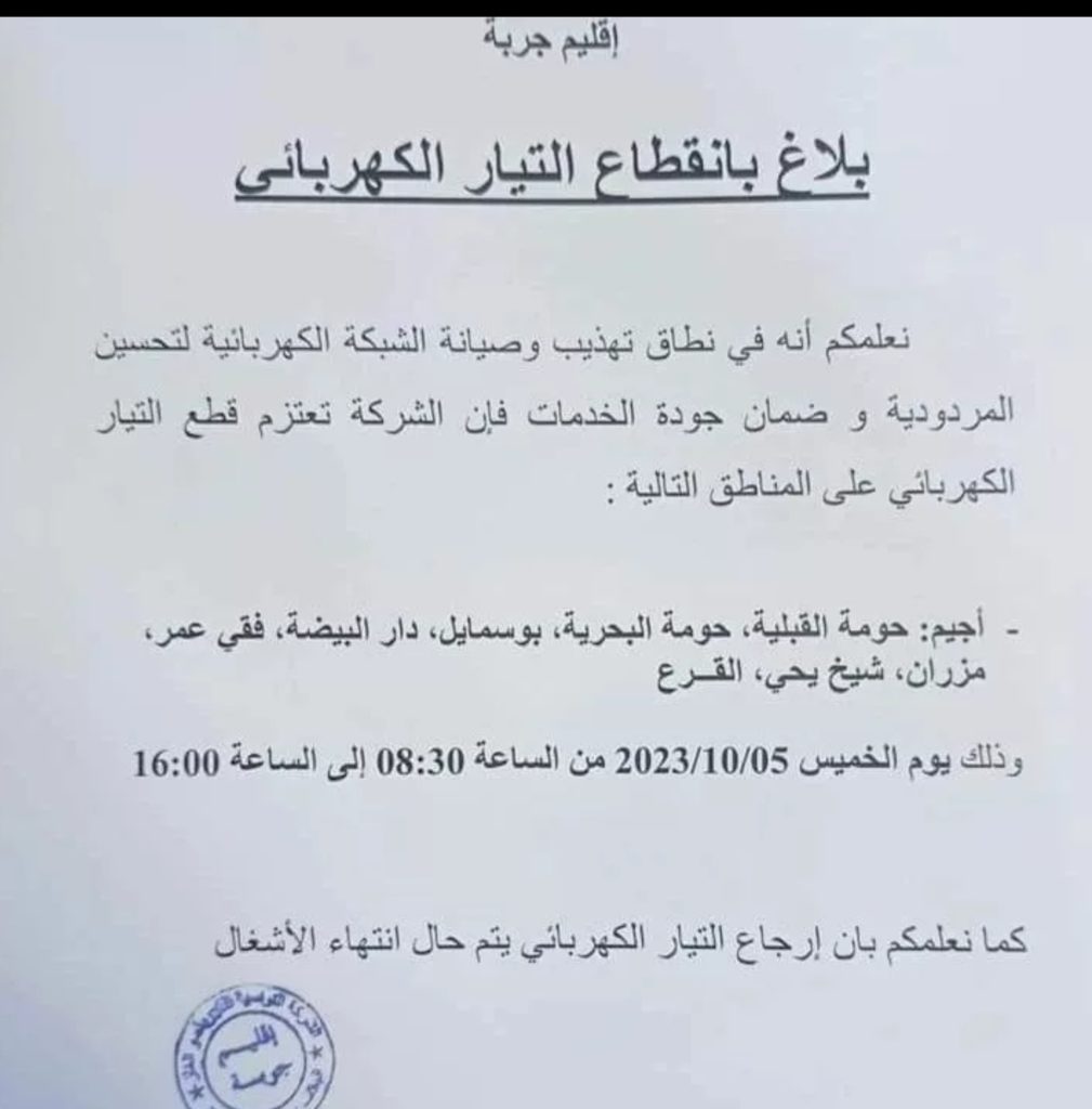 جربة في نطاق برنامجها الدوري لصيانة شبكات توزيع الكهرباء وحرصا منها على ضمان أجود الخدمات. تقوم الشركة التونسية للكهرباء والغاز (إقليم جربة)، بقطع التيار الكهربائي، غدا الخميس 5 اكتوبر 2023. من الساعة الثامنة والنصف صباحا إلى الساعة الرابعة مساء. وذلك على الأماكن المذكورة في الصورة اسفله: