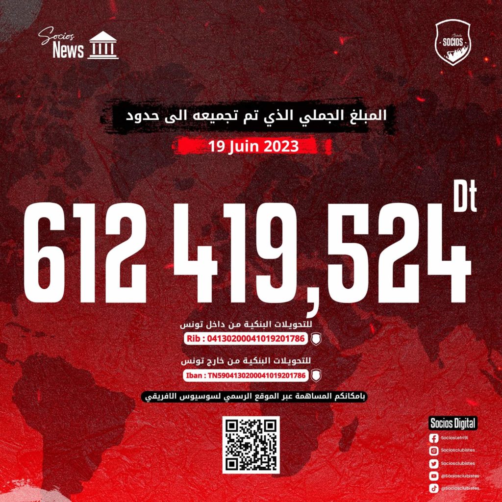 إليكم التحديث اليومي للمبلغ الجملي الذي تم تجميعه الى حدود يوم 19 جوان 2023 و ذلك من خلال التحويلات البنكية .. التحويلات البريدية .. و المساهمات المالية التي تم ارسالها عبر منصة سوسيوس النادي الإفريقي.