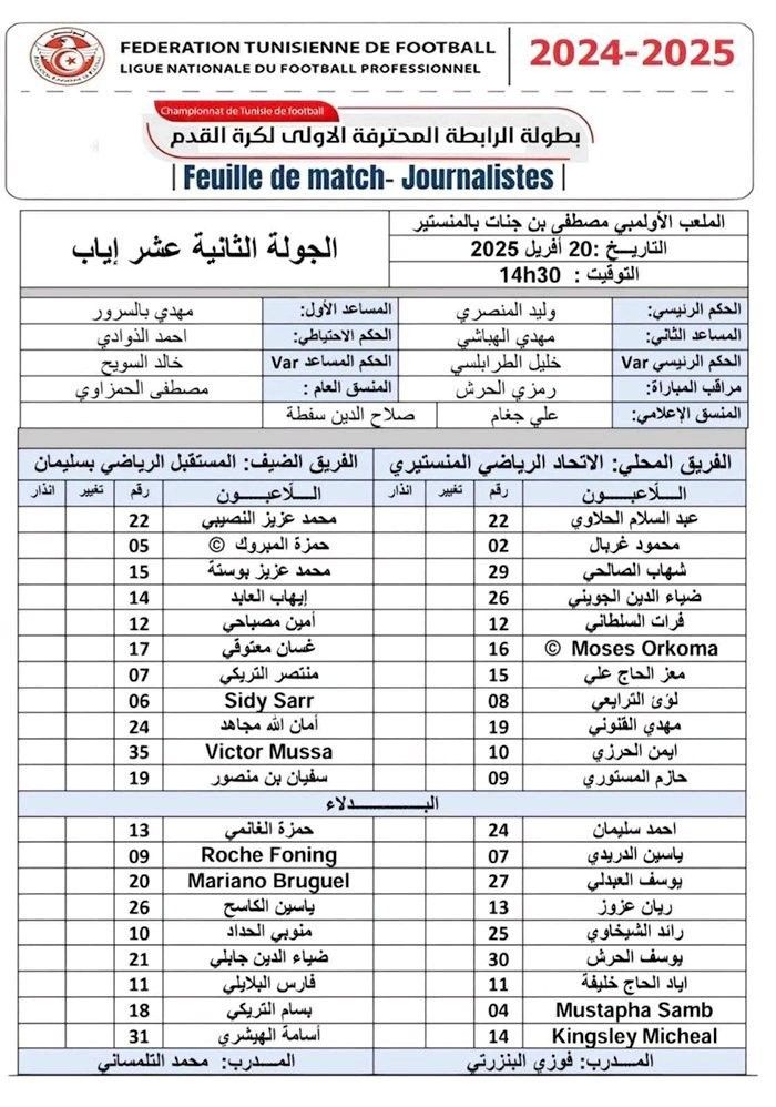 تقام اليوم الأحد 20 أفريل 2025 مباراة الجولة 12 إيابا (الجولة 27) من منافسات بطولة الرابطة المحترفة الأولى لكرة القدم التي تجمع بين الاتّحاد الرياضي المنستيري وضيفه المستقبل الرياضي بسليمان.