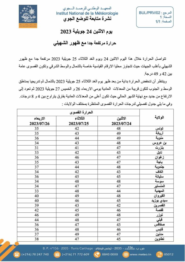 تتواصل الحرارة مرتفعة جدا خلال هذا اليوم خصوصا بالوسط الشرقي والجنوب مع ظهور الشهيلي ومن المنتظر ان تتراوح القصوى بين 39 و49 درجة بإستثناء السواحل الشمالية حيث تكون بين 30 و36 درجة..
