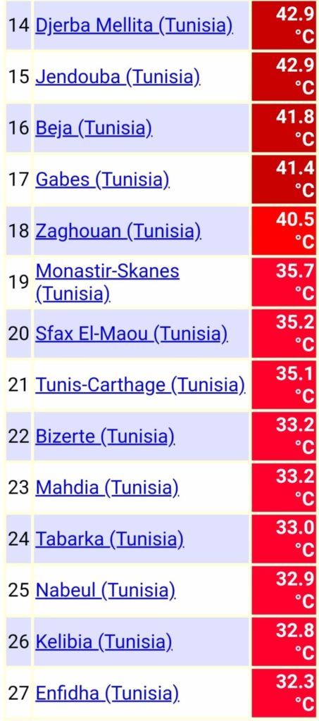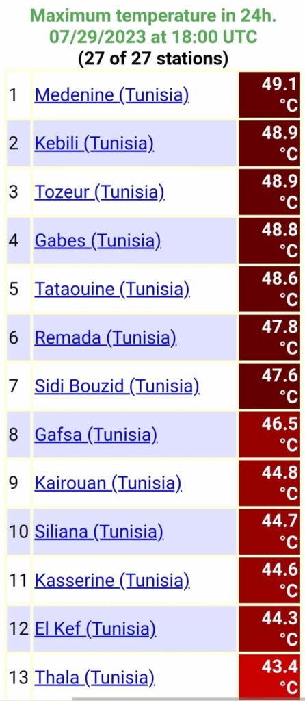 -رقم قياسي ايضا بتطاوين حيث بلغت 48.6 في حين ان رقمها السابق هو 48.5.. - سيدي بوزيد ايضا عرفت رقما قياسيا جديدا وبلغت فيها الحرارة 47.6..