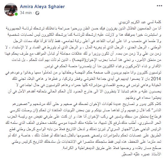 وووجه عميرة عليه الصغير رسالة الى عبد الكريم الزبيدي، نشرها على صفحته بموقع الفايسبوك، حذر فيها عبد الكريم الزبيدي أن يكون “العصفور النادر” لحركة النهضة.