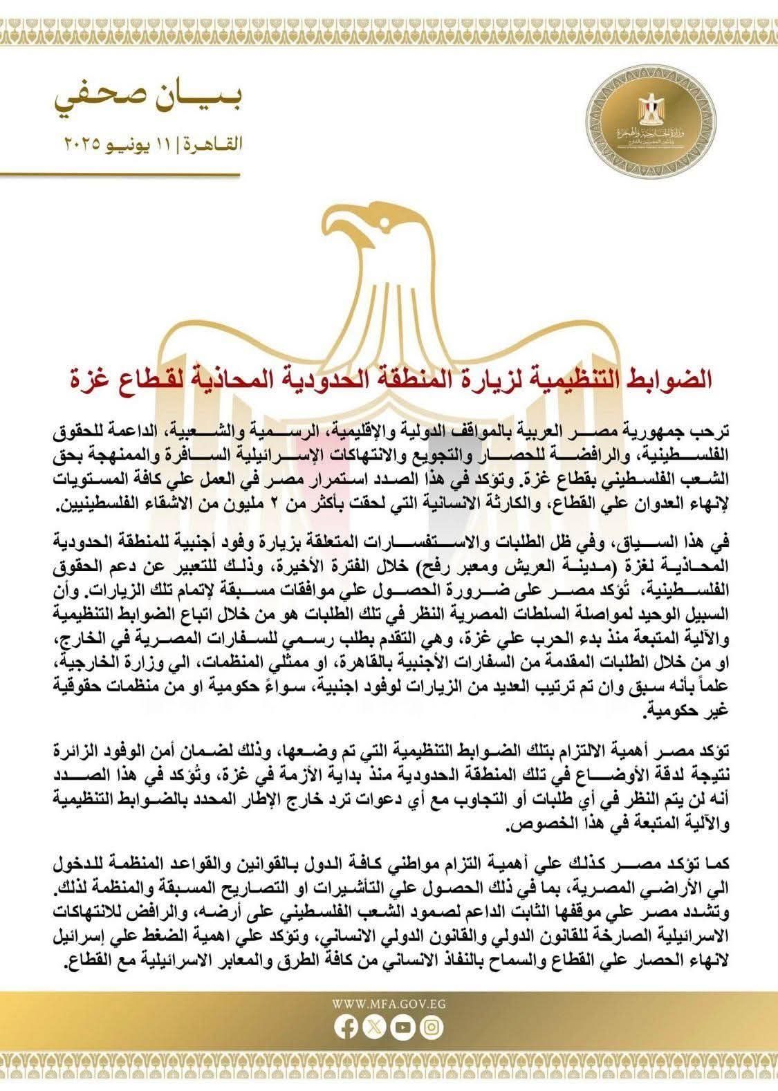 يُوضح البيان أن الطلبات والاستفسارات المتعلقة بزيارة الوفود الأجنبية للمنطقة الحدودية المحاذية لغزة (مدينة العريش ومعبر رفح) قد تزايدت مؤخرًا. وفي هذا السياق، تؤكد مصر على ضرورة الحصول على موافقات مسبقة لإتمام تلك الزيارات، وأن السلطات المصرية هي الجهة الوحيدة المخولة بالنظر في هذه الطلبات.