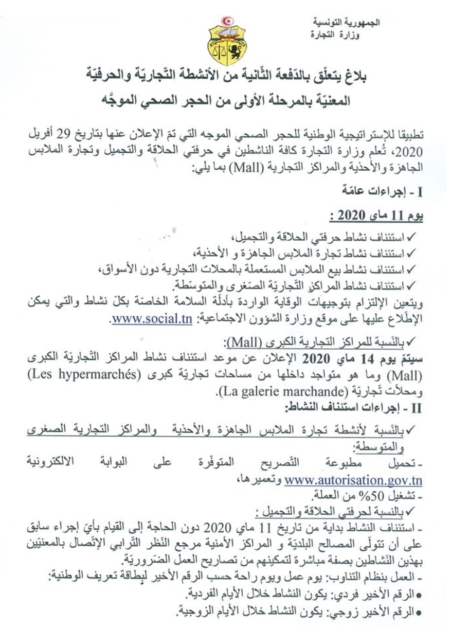 أصدرت وزارة التجارة اليوم السبت 9 ماي 2020 بلاغا يتعلّق بالدفعة الثانية من الأنشطة التجارية والحرفية المعنيّة بالمرحلة الأولى من الحجر الصحّي التي تنطلق بعد غد الإثنين 11 ماي، ومن بينها نشاط حرفتي الحلاقة والتجميل.