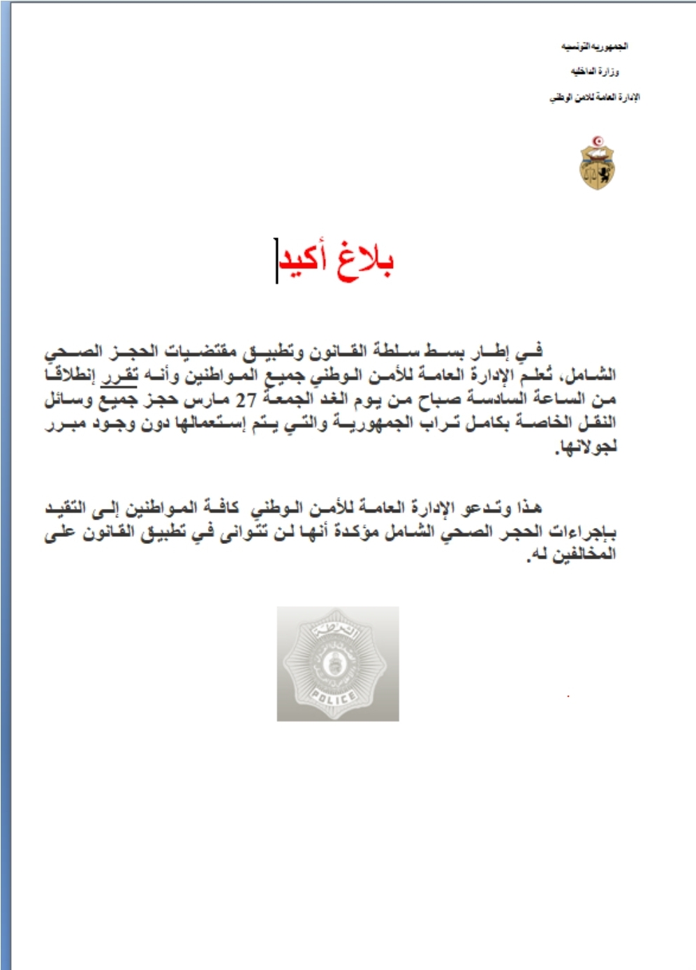 أعلنت الإدارة العامة للأمن الوطني في بلاغ الخميس 26 مارس 2020 أنه في إطار بسط القانون وتطبيق مقتضيات الحجز الصحي الشامل سيتم انطلاقا من الساعة السادسة من صباح يوم غد الجمعة 27 مارس 2020 حجز جميع وسائل النقل الخاصة بكامل تراب الجمهورية والتي يتم استعمالها دون وجود مبرر لجولانها.