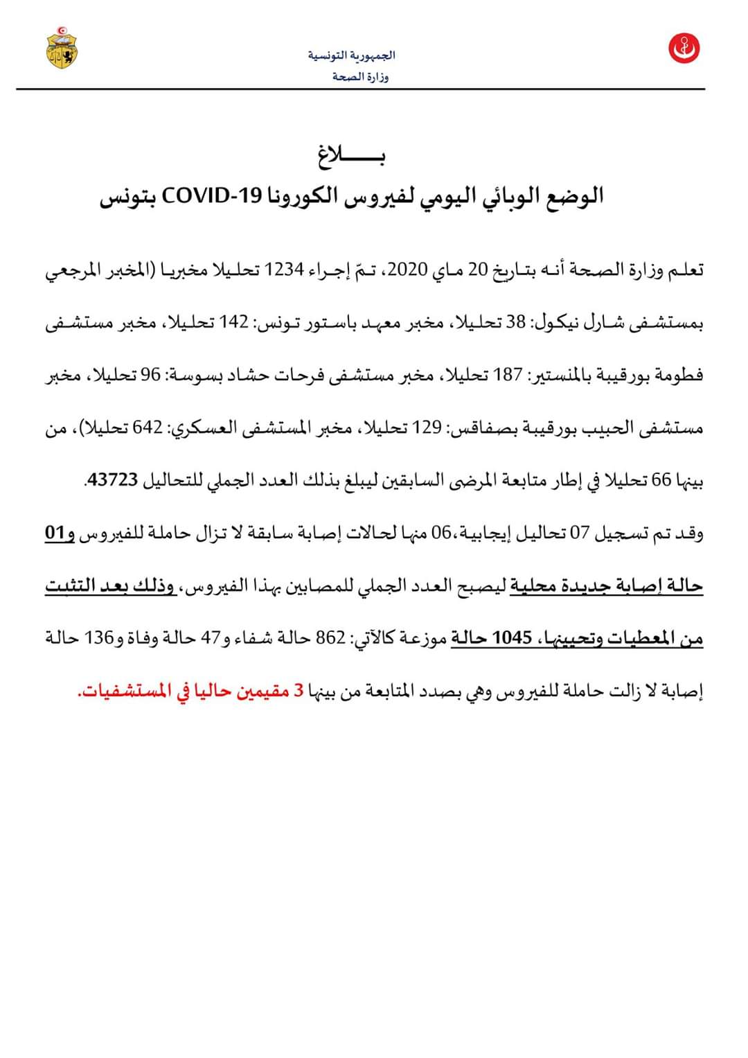 تعلم وزارة الصحة أنه بتاريخ 20 ماي 2020، تمّ إجراء 1234 تحليلا مخبريا (المخبر المرجعي بمستشفى شارل نيكول: 38 تحليلا، مخبر معهد باستور تونس: 142 تحليلا، مخبر مستشفى فطومة بورقيبة بالمنستير: 187 تحليلا، مخبر مستشفى فرحات حشاد بسوسة: 96 تحليلا، مخبر مستشفى الحبيب بورقيبة بصفاقس: 129 تحليلا، مخبر المستشفى العسكري: 642 تحليلا)، من بينها 66 تحليلا في إطار متابعة المرضى السابقين ليبلغ بذلك العدد الجملي للتحاليل 43723.