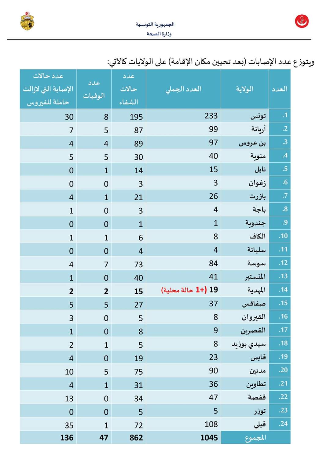 وقد تم تسجيل 07 تحاليل إيجابية، 06 منها لحالات إصابة سابقة لا تزال حاملة للفيروس و01 حالة إصابة جديدة محلية ليصبح العدد الجملي للمصابين بهذا الفيروس، وذلك بعد التثبت من المعطيات وتحيينها، 1045 حالة موزعة كالآتي: 862 حالة شفاء و47 حالة وفاة و136 حالة إصابة لا زالت حاملة للفيروس وهي بصدد المتابعة من بينها 3 مقيمين حاليا في المستشفيات.