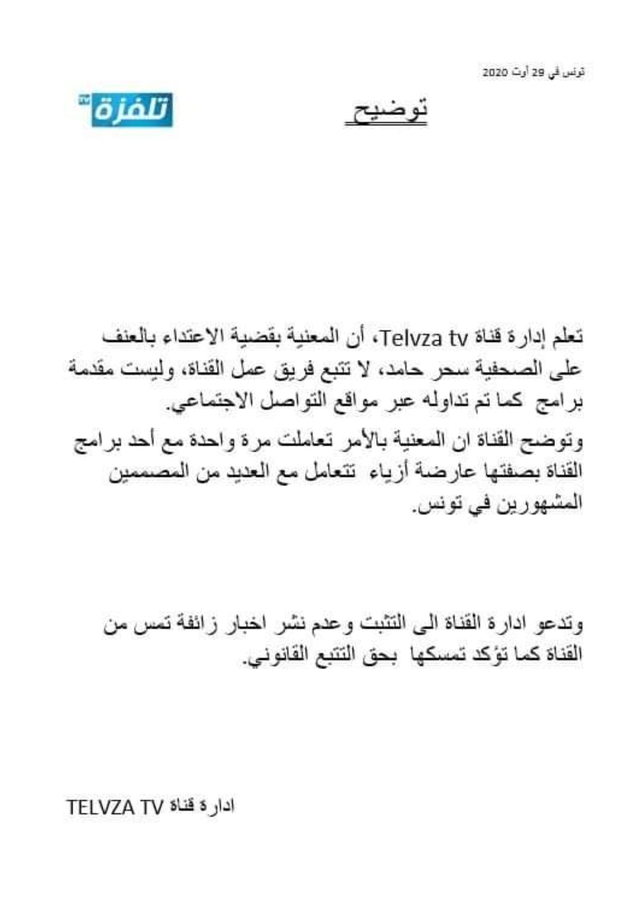 من جهتها أكدت قناة تلفزة تي في الخاصة انها تعاملت مع المعنية بالأمر في تصوير حلقة واحدة من برنامج Telvza Glam وتقديمه بوصفها شخصية معروفة في مجال الموضة والازياء.