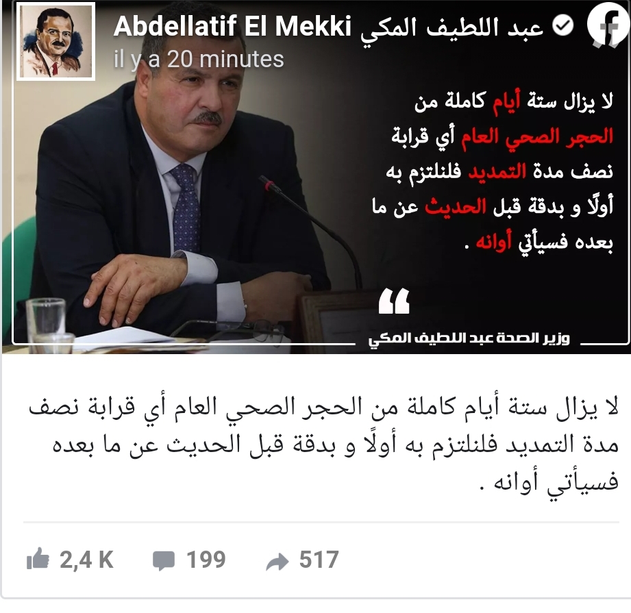 دوّن الوزير على صفحته “لا يزال ستة أيام كاملة من الحجر الصحي العام أي قرابة نصف مدة التمديد فلنلتزم به أولًا و بدقة قبل الحديث عن ما بعده فسيأتي أوانه” وفق قوله.