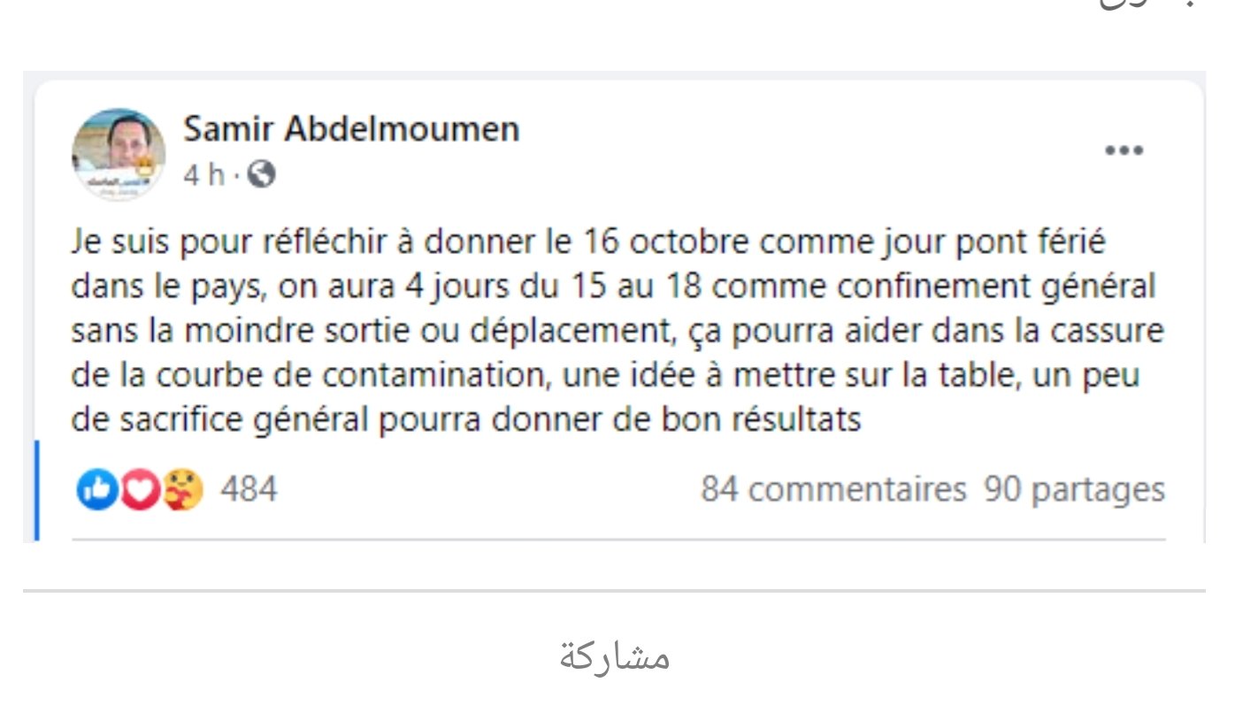 وقال الدكتور عبد المومن في تدوينة على صفحته على فايسبوك ”يمكن لهذه الأيام الأربعة من الحجر العام أن تكسر سلسلة العدوى.. هي فكرة للتدارس.. بعض التضحية العامة يمكن أن يكون ذات جدوى”.