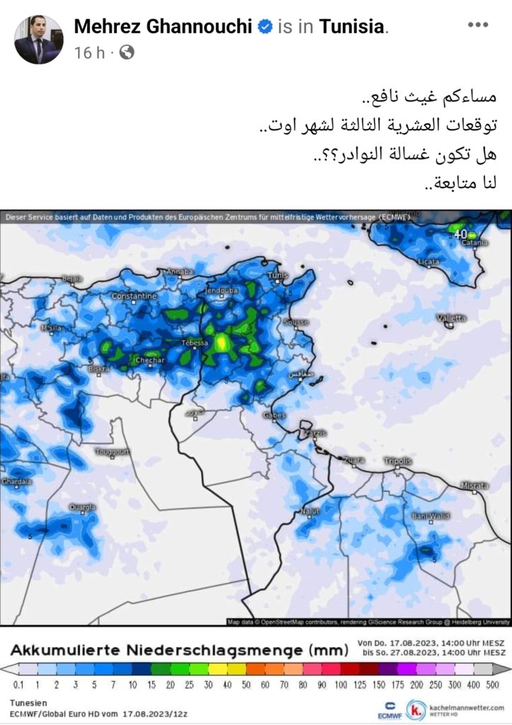 وقد أفاد احد الخبراء في طقس تونس بأنه يُتوقع هطول أمطار غزيرة أحيانًا خلال هذه الفترة.