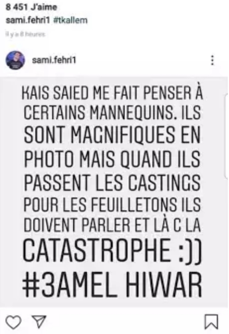 ”في سقوط أخلاقي”/سامي الفهري يستفزّ قيس سعيّد ويشبهه بعارضات الأزياء (صور)