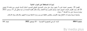 وتُضبط شروط واجراءات الانتفاع بهذه القروض بمقتضى اتفاقية تبرم بين وزارة المالية ووزارة التجهيز والإسكان وبنك الإسكان.