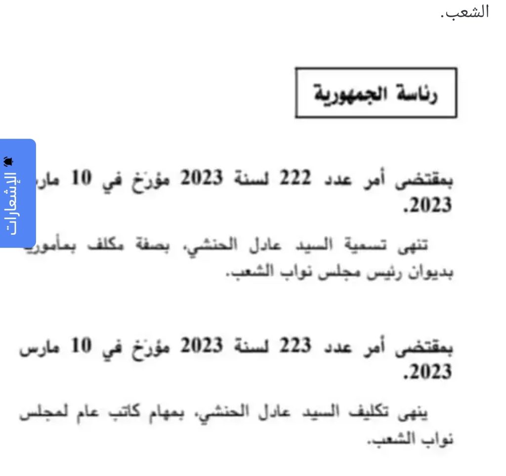 وتم بمقتضى أمرين رئاسيين مؤرخين في 10 مارس الجاري انهاء تكليف عادل الحنشي بمهام كاتب عام لمجلس نواب الشعب و انهاء تسميته مكلّفا بمأمورية بديوان رئيس مجلس نواب الشعب .