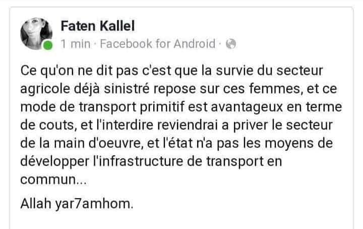 وكتبت قلال في التدوينة،”ما لا نقوله هو أن بقاء القطاع الزراعي يعتمد على هؤلاء النساء، وأن هذا النمط البدائي من وسائل النقل مفيد من حيث التكاليف، وحظره سيعود لحرمان القطاع من يد لا تملك الدولة الوسائل اللازمة لتطوير البنية التحتية للنقل العام”.