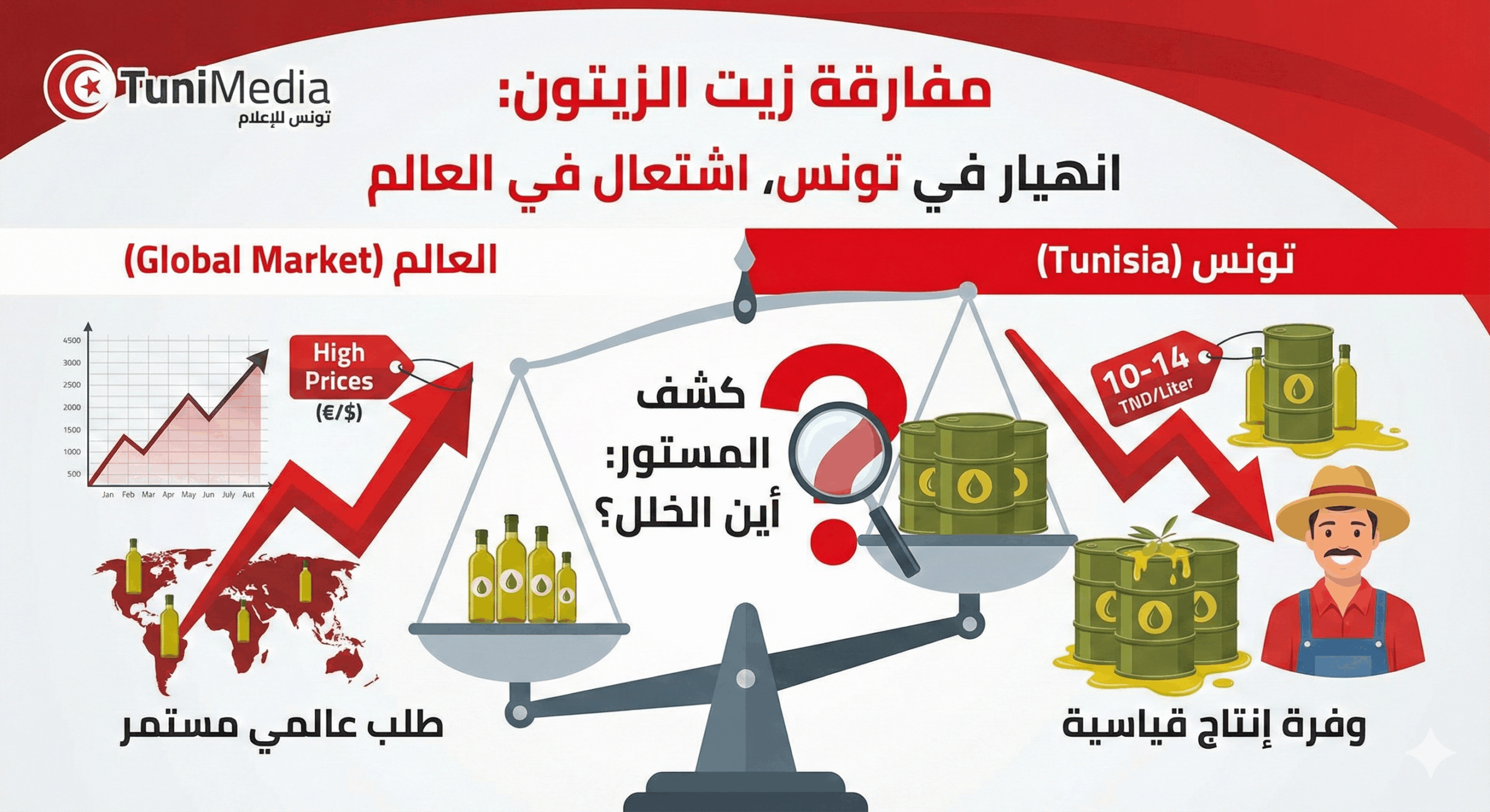Meta Description: تقرير موسع حول أزمة أسعار زيت الزيتون في تونس، مقارنة بالسوق العالمية، مع تحليل اقتصادي وتفسير أسباب البيع بأسعار منخفضة، وتأثير غياب التدخل الحكومي، ومصادر خارجية توثق محرّكات الأزمة وتداعياتها.