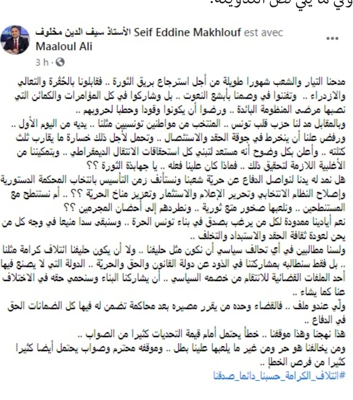 أعلن رئيس كتلة ائتلاف الكرامة سيف الدين مخلوف، اليوم السبت، في تدوينة نشرها على صفحته الرسمية على فايسبوك، عن تحالف جديد لإتلاف الكرامة مع حزب قلب تونس، قائلاً:” بعد الخذلان الذي تلقيناه من التيار والشعب.. مد لنا حزب قلب تونس في المقابل يديه”.
