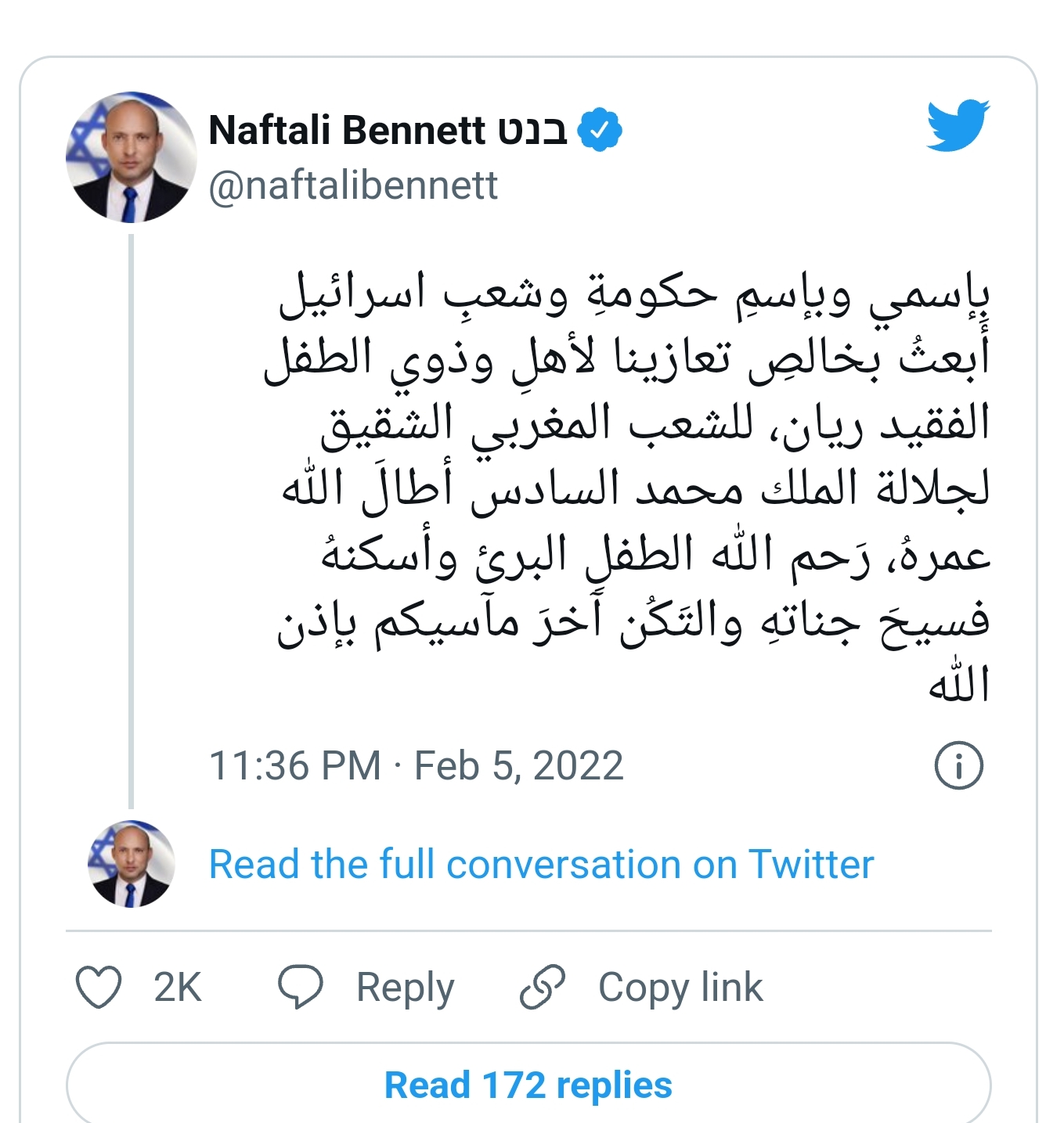 من جانبه كتب بينيت في تغريدة عبر “تويتر”: “باسمي واسم حكومة إسرائيل وشعبها، أبعث بخالص تعازينا لأهل الطفل المرحوم ريان وللشعب المغربي وجلالة الملك محمد السادس، أطال الله عمره. رحم الله هذا الطفل البريء وأسكنه فسيح جناته. ولتكن هذه آخر مآسيكم، بإذن الله”.