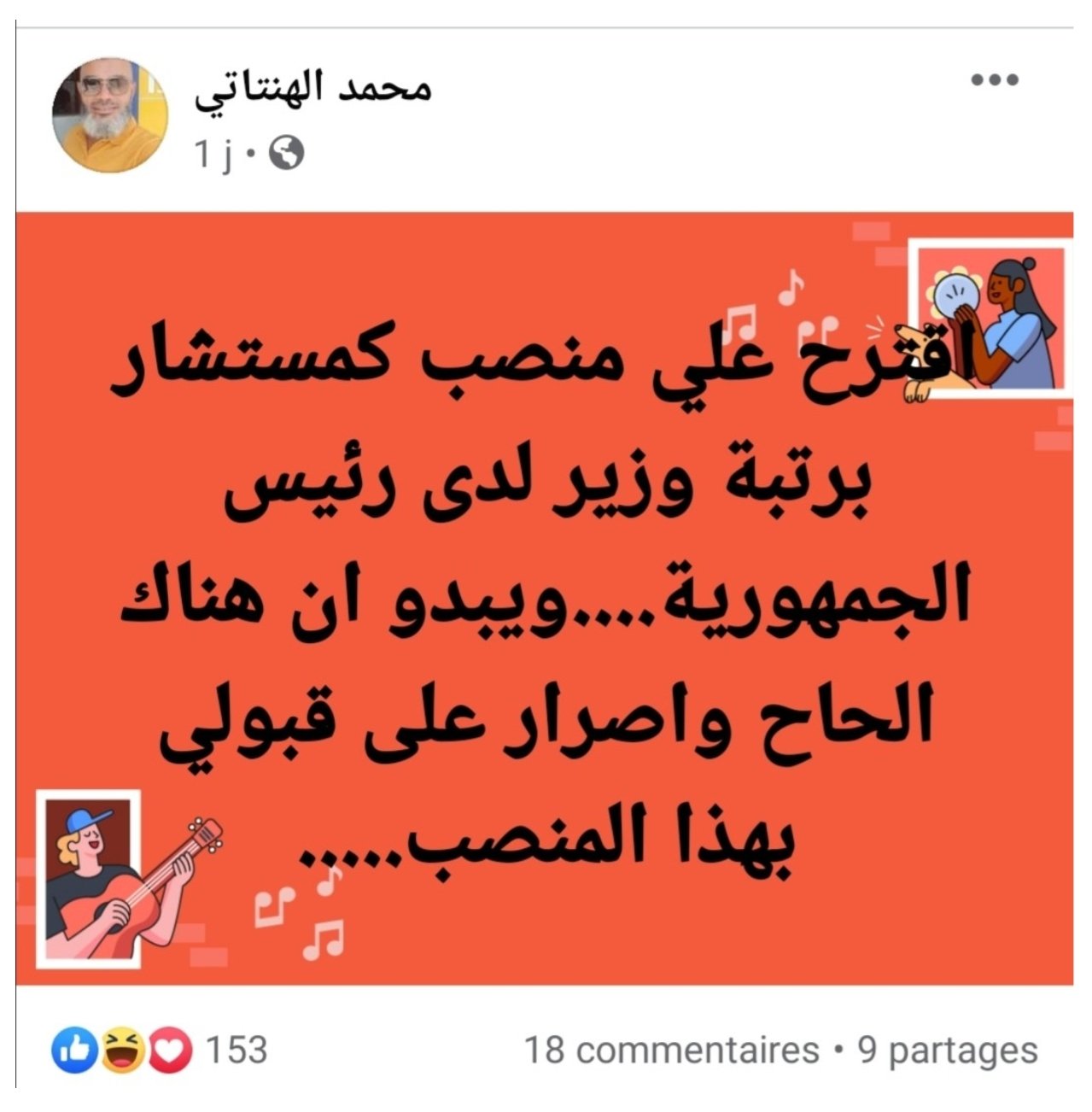 قال الداعية، محمد الهنتاتي على صفحته بفايسبوك انه تم عرض منصب مستشار رئاسي برتبة وزير عليه من طرف رئيس الجمهورية قيس سعيد وفق قوله.