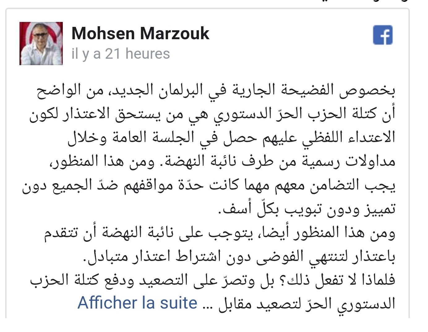 اعتبر رئيس حركة مشروع تونس، محسن مرزوق بخصوص ما وصفه “بالفضيحة” الجارية في البرلمان الجديد، أنه من الواضح أن كتلة الحزب الحرّ الدستوري هي من يستحق الاعتذار من طرف نائبة النهضة لكون الاعتداء اللفظي عليهم حصل في الجلسة العامة وخلال مداولات رسمية.