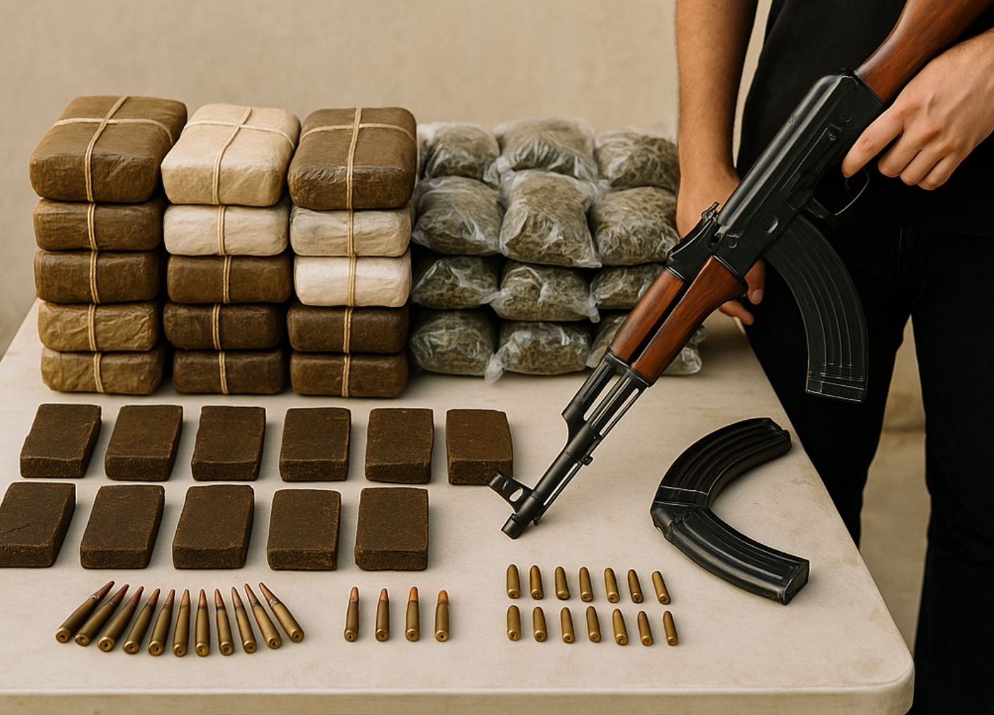 أسفرت المداهمة عن ضبط كميات ضخمة من المواد المخدرة المتنوعة، من بينها عبوات كبيرة من الحشيش وأكياس مملوءة بالمواد المخدرة الأخرى. كما عُثر على سلاح ناري آلي وذخائر حية، ما يؤكد استعداد المتهم الدائم لاستخدام القوة لمواجهة أي محاولات للقبض عليه.