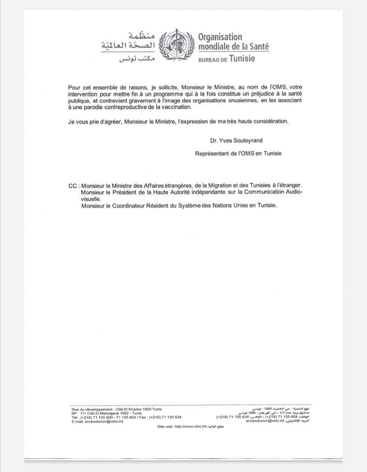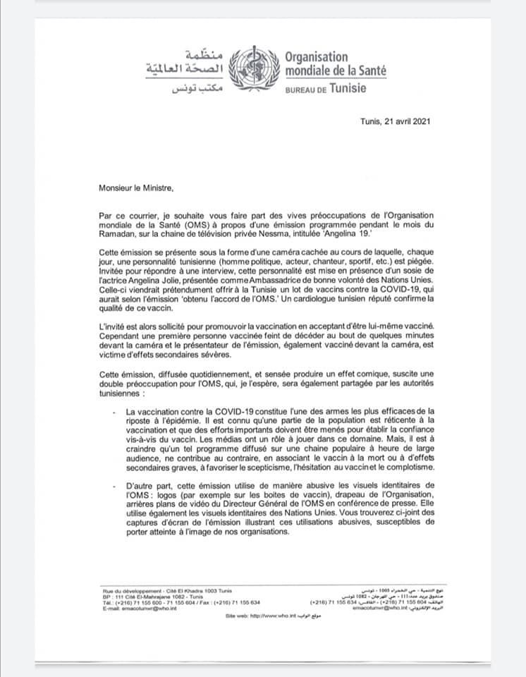 طالبت منظمة الصحة العالمية في مراسلة رسمية لوزارة الخارجية بايقاف بث الكاميرا الخفية انجلينا التي تبثها قناة نسمة