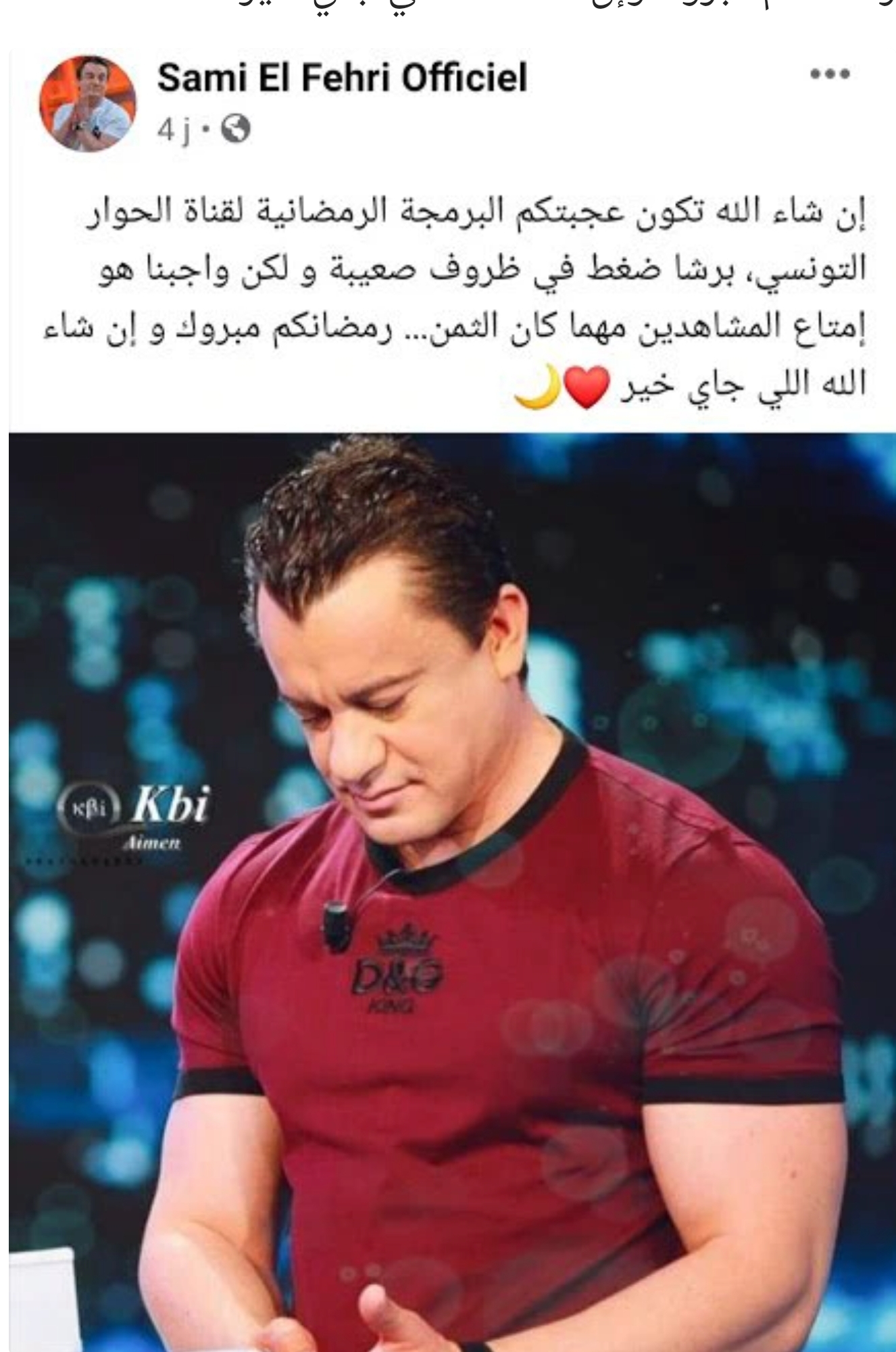 أكدت مصادر إعلامية مطلعة، أن الإعلامي سامي الفهري المسجون منذ أكثر من شهرين ، قد بعث برسالة خاصة الى كل مشاهدي ومحبي قناة الحوار التونسي بمناسبة شهر رمضان نشرتها زوجته على صفحته الخاصة.وهذا ماجاء في الرسالة : ” إن شاء الله تكون عجبتكم البرمجة الرمضانية لقناة الحوار التونسي، برشا ضغط في ظروف صعيبة و لكن واجبنا هو إمتاع المشاهدين مهما كان الثمن… رمضانكم مبروك وإن شاء الله اللي جاي خير.”