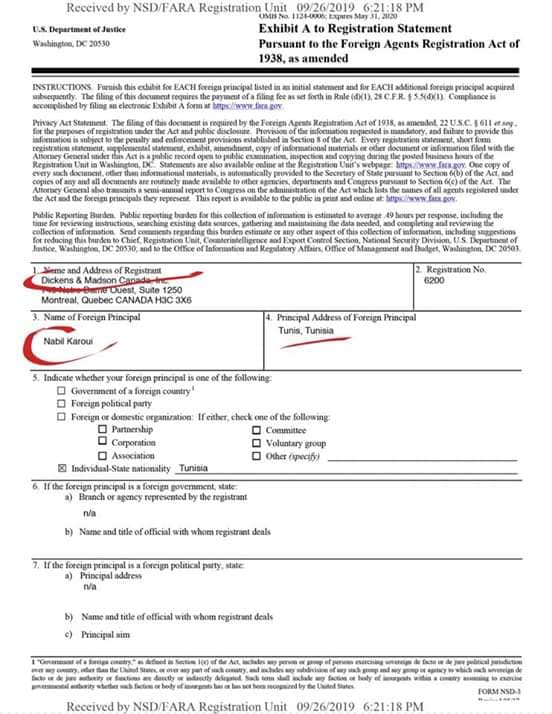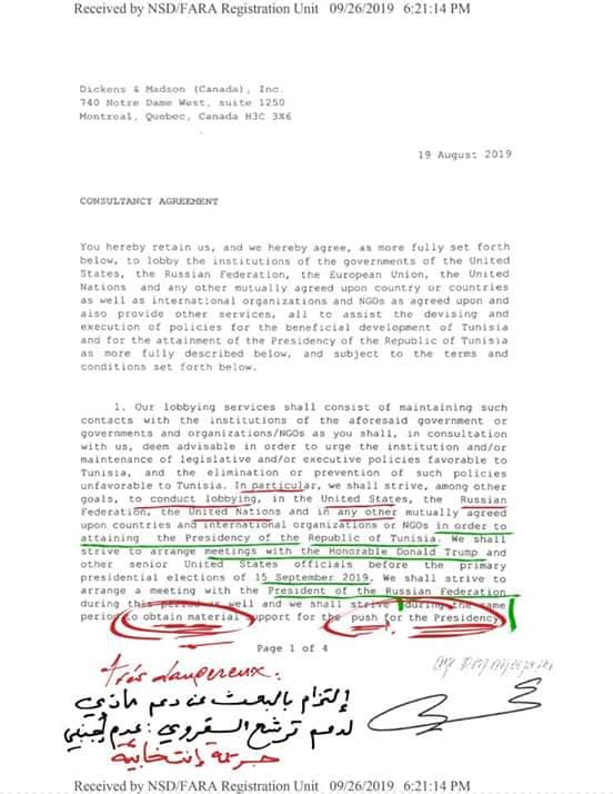 أفاد موقع “لوبيينغ آل مونيتور”، المختصّ في كشف أنشطة جماعات الضغط، أن مرشح “قلب تونس” نبيل القروي للانتخابات الرئاسية، الموقوف حاليًا على ذمة قضية تهرب ضريبي، أبرم عقدًا بقيمة مليون دولار مع شركة “دينكنز أند مادسون” (Dickens and Madson) مقرّها في كندا ويديرها إسرائيلي عمل في الاستخبارات الصهيونية، وذلك من أجل الضغط على الولايات المتحدة وروسيا والاتحاد الأوروبي والأمم المتحدة بهدف “الحصول على رئاسة الجمهورية التونسية”.