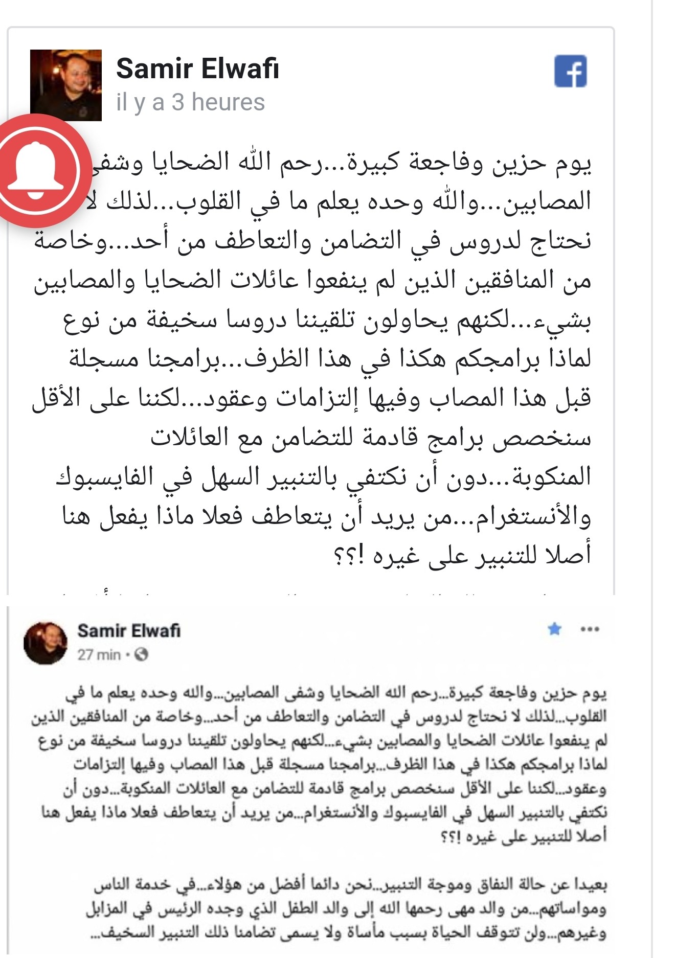 نشر الإعلامي سمير الوافي ،تحديثة على حسابه الشخصي بالفايسبوك ،أعرب فيها عن تضامنه مع عائلات ضحايا إنقلاب الحافلة بعمدون ،الفاجعة التي راح ضحيتها عشرات الشباب،و انتقد الوافي في ذات التدوينة ما أسماه “تنبير المنافقين” في علاقة بتواصل البرمجة العادية في التلفزات و أردف الوافي ،بأن الحياة لن تتوقف بسبب مأساة خاصة أن البرامج مسجلة و مرتبطة بإلتزامات و عقود ،في إشارة إلى بث برنامج وحش الشاشة في توقيته العادي …