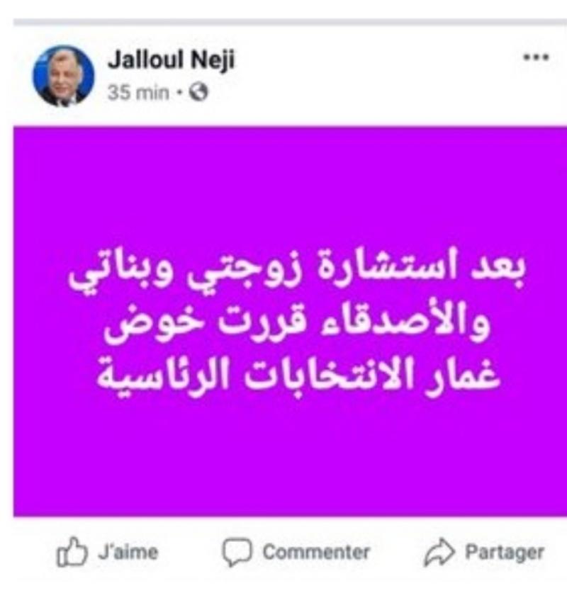 قرر مدير المعهد التونسي للدراسات الإستراتيجية والسياسي والقيادي السابق في حركة نداء تونس ناجي جلول الترشح للانتخابات الرئاسية المبكرة التي ستُجرى يوم 15 سبتمبر القادم.وكتب ناجي جلول باللون البنفسجي على صفحته الرسمية على الفايسبوك، إنه اتخذ هذا القرار بعد استشارة زوجته وبناته وأصدقائه.