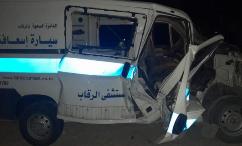 توفي أمس شخص وأصيب آخران بجروح متفاوتة الخطورة في إصطدام سيارة إسعاف تابعة لمستشفى معتمدية الرقاب من ولاية سيدي بوزيد، أثناء نقلها لمصاب في حادث مرور سابق إلى المستشفى الجامعي بصفاقس. وحسب مصدر من الحماية المدنية بالجهة فإن الحادث جد حوالي منتصف الليل بالطريق المحلية بمنطقة أولاد عيوني، وأن المتوفى كان قد أصيب بجروح حادث المرور الأول حيث اصطدمت دراجته النارية بدراجة أخرى قبل حوالي ساعة من توقيت الحادث الثاني الذي توفي على إثره .