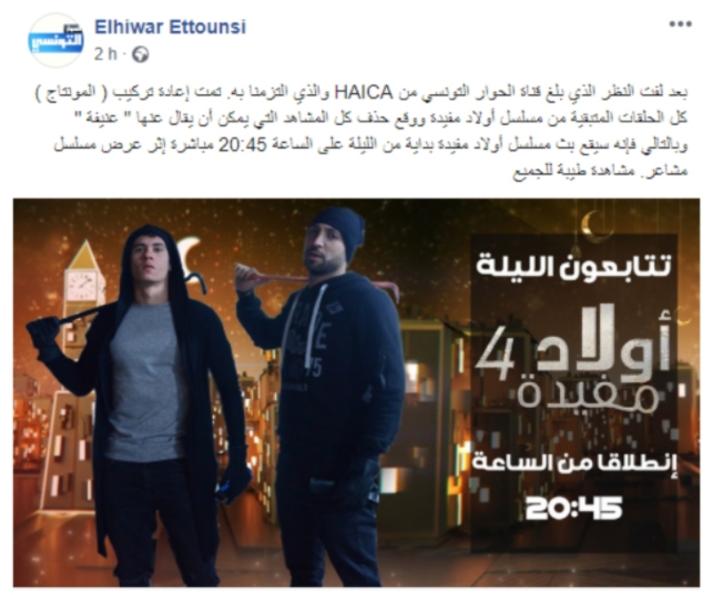 وقالت القناة في تدوينة على صفحتها على الفايسبوك انه وبعد لفت النظر الذي بلغ قناة الحوار التونسي من “الهايكا” والذي التزمت به، قامت بإعادة تركيب ( المونتاج ) كل الحلقات المتبقية من مسلسل أولاد مفيدة ووقع حذف كل المشاهد التي يقال عنها ” عنيفة” وبالتالي فإنه سيقع بث المسلسل بداية من الليلة على الساعة 20:45 مباشرة إثر عرض مسلسل مشاعر، وفق مانشرت القناة في صفحتها على الفايسبوك.