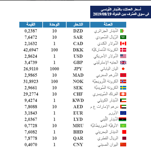 أسعار العملات بالدّينار التّونسي