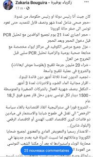 شهدت تونس خلال هذا الاسبوع ارتفاع في عدد حالات الاصابة بالكورونا خاصة مع انطلاق عملية التلقيح و انتشار السلالة البريطانية في عديد المناطق خاصة و انها سريعة والانتشار يعود الدكتور زكريا بو قرة بتدوينة مثيرة للجدل هذا نص التدوينةكان جيت أنا رئيس دولة او رئيس حكومة، من غدوةحجر صحي شامل لمدة شهر ونصف قابل للتمديد حتى تعود تونس الى صفر حالة كورونا حجر اجباري لمدة 21 يوم لجميع الوافدين مع تحليل PCR قبل دخول الحجر وبعد الحجر عزل جميع مرضى الكوفيد في مراكز ايواء مخصصة مع متابعة صحية يومية والزامية تحليل PCR سلبي قبل الخروج من العزل شراء 20 مليون جرعة تلقيح (بفلوسنا موش ايعانات) والشروع في عملية تلقيح واسعة تجميد الديون لمدة ثلاثة أشهر دون فائدة للبنوك اقرار مجانية الماء الضوء والانترنات لمدة 3 أشهر التكفل بنصف شهرية العمال بالشركات الصغيرة والمتوسطة 1500 دينار لكل تونسي بدون دخل قار عمرو فوق ال18 عام الشروع فورا في ستراتيجية انقاذ اقتصادية بالغاء سياسة “الرخص” الي تقتل في طموح شبابنا والاستثمار في ميادين ذو فائدات كبرى كاقتصاد القنب الهندي أو الاقتصاد الرقمي (البلوك شاين)… الاعتذار رسميا والتعويض المادي والمعنوي لجميع ضحايا الكورونا وعائلاتهم لما تسببت الدولة فيه بعدم جديتها في محاربة الوباء واستيرادها له بعد أن مكننا الشعب التونسي من العودة الى الصفر حالة احالة جميع المسؤولين السياسيين والعلميين الذين تسببو في عودة الوباء وانتشاره على العدالة مع مراقبة من المجتمع المدني ومحاسبة كل من استهزأ بحياة وصحة المواطن التونسي.
