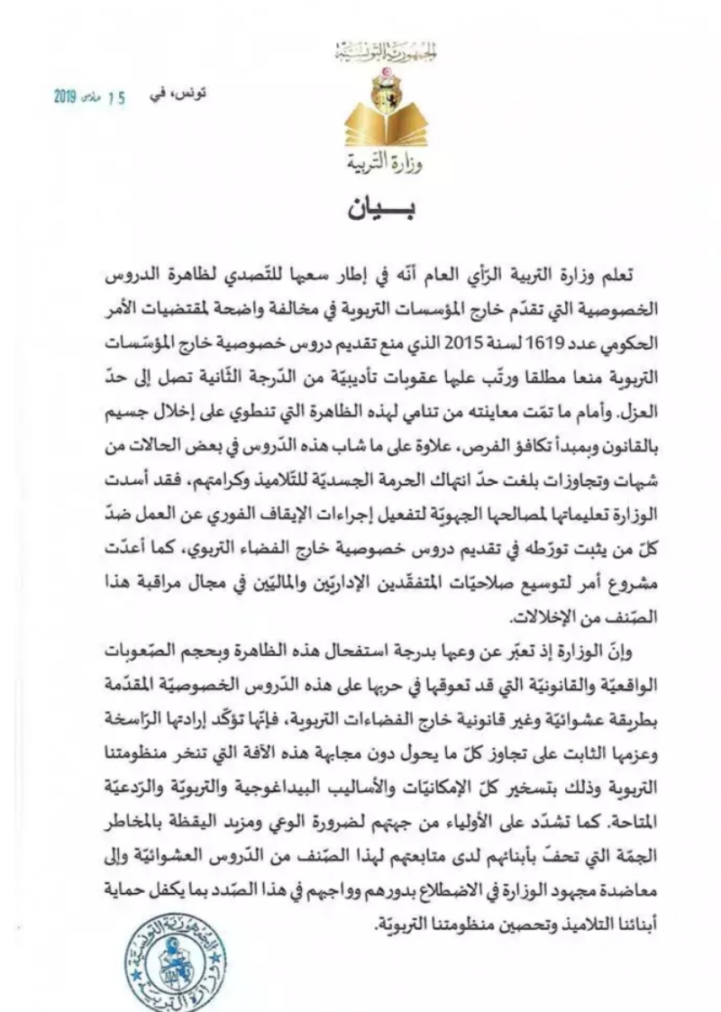 وزارة التربية تقرر الايقاف الفوري عن العمل لكل شخص يقدم “الدروس الخصوصية” خارج المؤسسات التربوية
