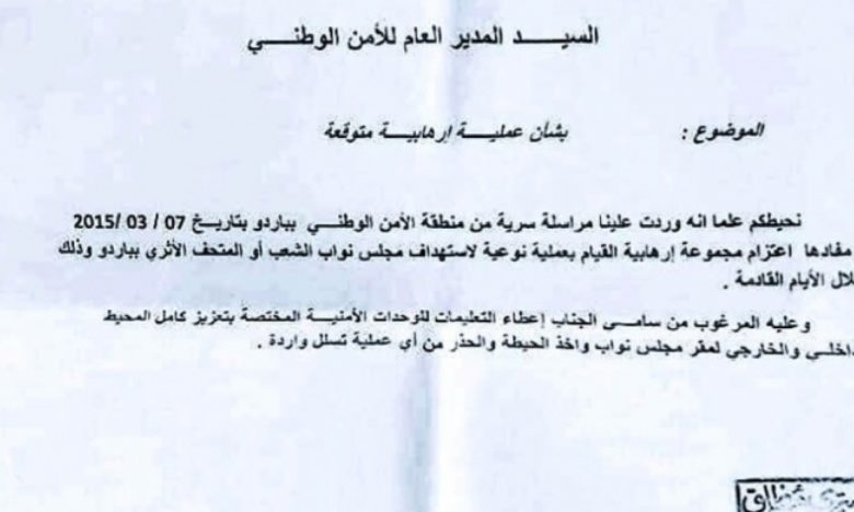 بخصوص تداول وثيقة منسوبة للمؤسسة الأمنية تتعلق بعملية إرهابية متوقعة تزعم أن المدير العام للأمن العمومي أعلم المدير العام للأمن الوطني إعتزام مجموعة إرهابية القيام بعملية نوعيّة لإستهداف مجلس نواب الشعب أو المتحف الأثري بباردو وذلك قبل تنفيذها، أوضحت وزارة الداخلية أن هذه الوثيقة مفتعلة ولا وجود لها إدارايا وقانونيا وذلك لعدة إعتبارات، حسب البلاغ.