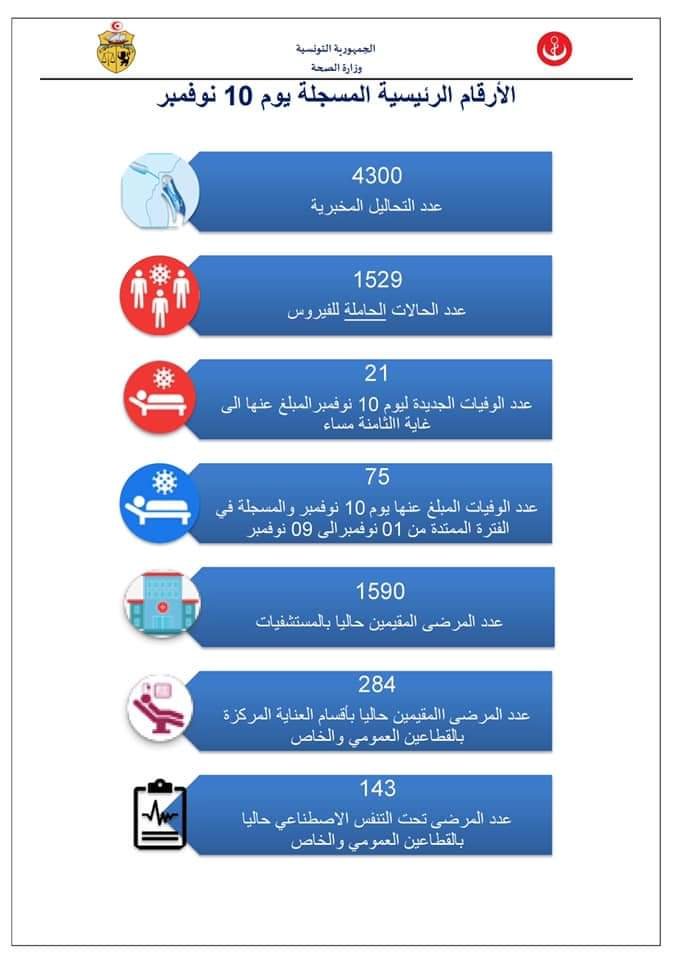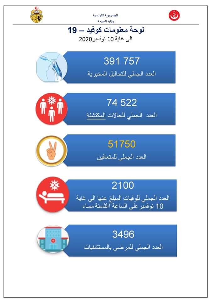 أعلنت وزارة الصحة اليوم الاربعاء انه تم تسجيل 1529 إصابة جديدة بفيروس كورونا المستجد وذلك من جملة 4300 تحليل مخبري بتاريخ 10 نوفمبر 2020 ليصبح عدد الحاملة للفيروس حتى هذا التاريخ 74522 مصاب.