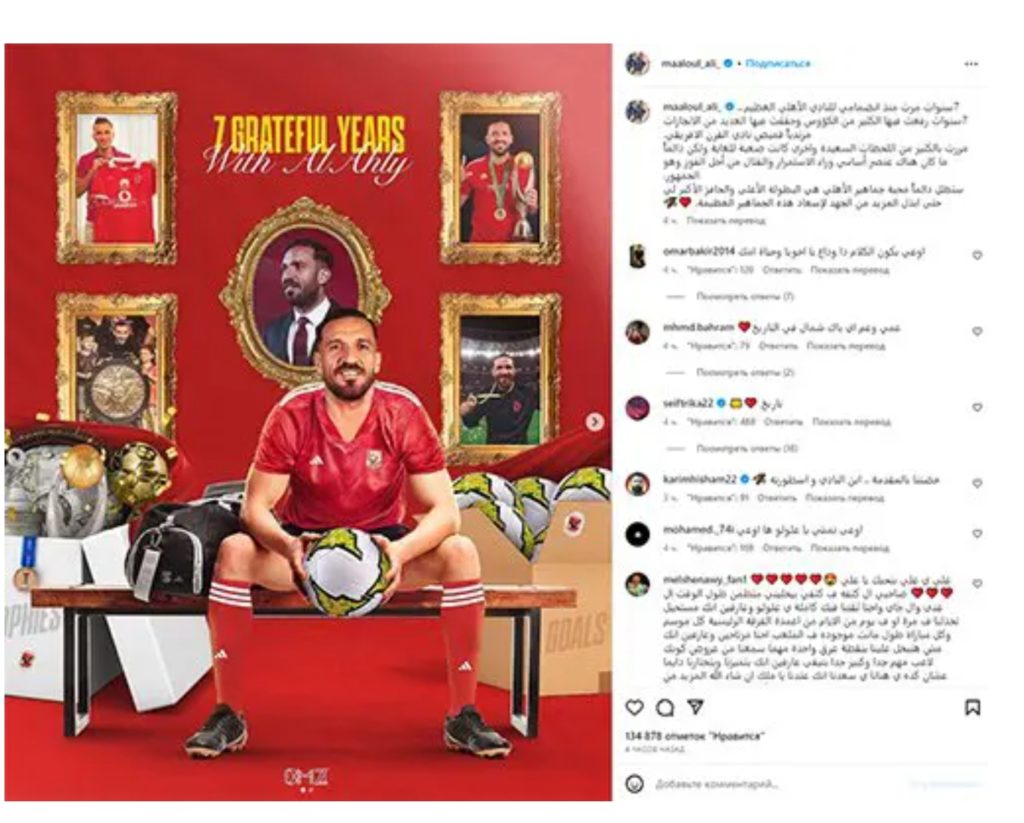 وكتب علي معلول عبر حسابه الشخصي على موقع “فيسبوك” للتواصل الاجتماعي: “7 سنوات مرت منذ انضمامي للنادي الأهلي العظيم، 7 سنوات رفعت فيها الكثير من الكؤوس وحققت فيها العديد من الإنجازات مرتدياً قميص نادي القرن الإفريقي.