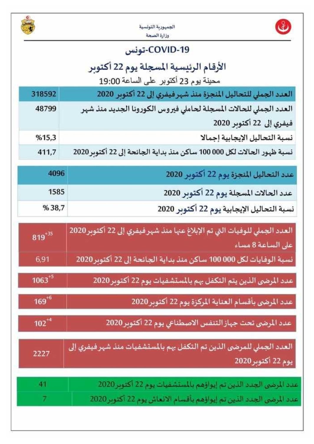 اعلنت وزارة الصحة أنّ عدد حالات الوفاة المسجلة يوم 22 أكتوبر الجاري بلغت 35 حالة وفاة ليبلغ العدد الجملي للوفيات منذ شهر فيفري وإلى حدود 22 أكتوبر الجاري، 819حالة وفاة.